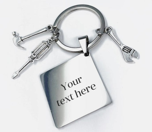 Personalised Rhombus Keychain with Hammer & Screwdriver Design – Custom Gift for Men in Silver
